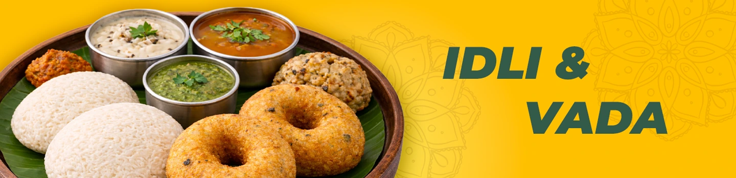 The perfect duo—one piece of soft classic idli paired with a crispy medu vada, served with sambar and chutney.